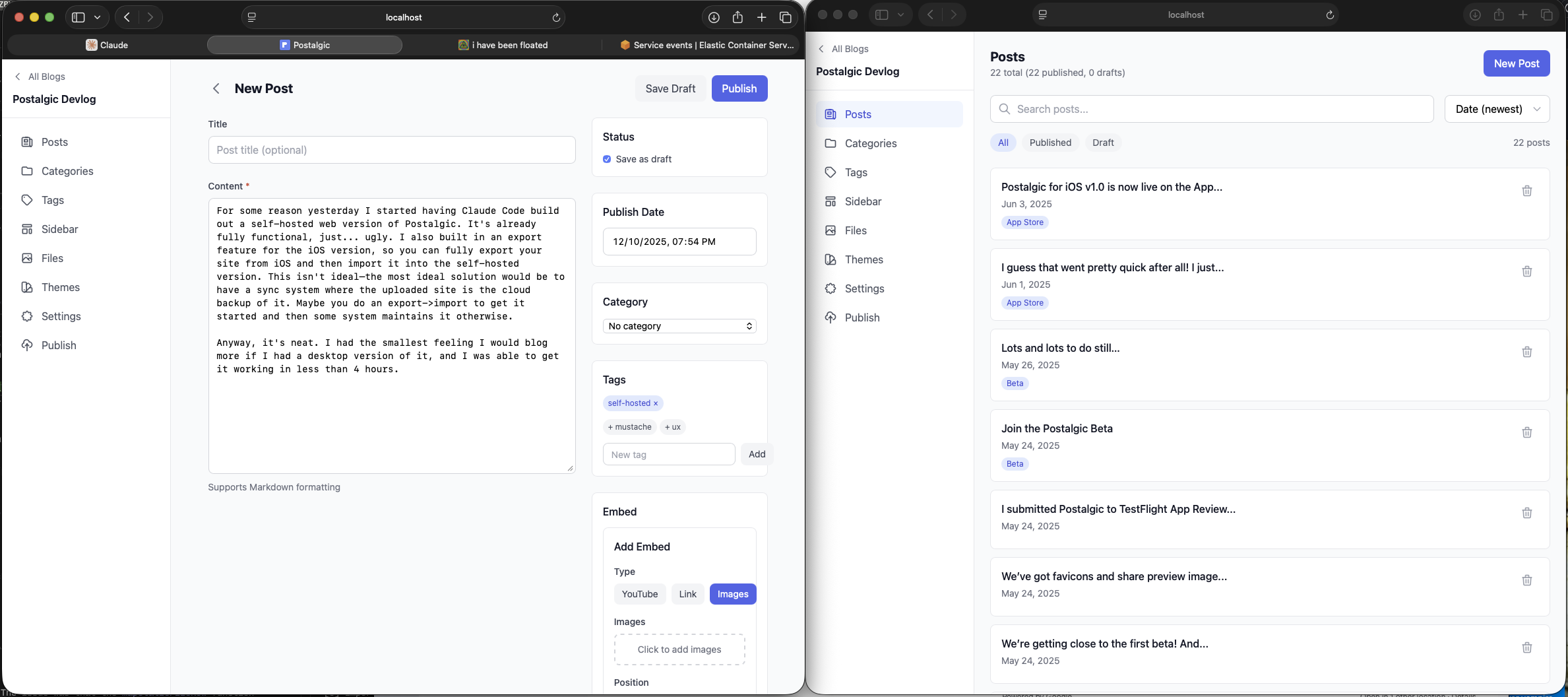 I won’t be turning my back entirely on Wordpress, as I’ve never had any real issues with my self-hosted instance over at https://amiantos.net, though it would be cool if Postalgic could be powerful enough to host my “full blog” and not smaller focused setups like staires.